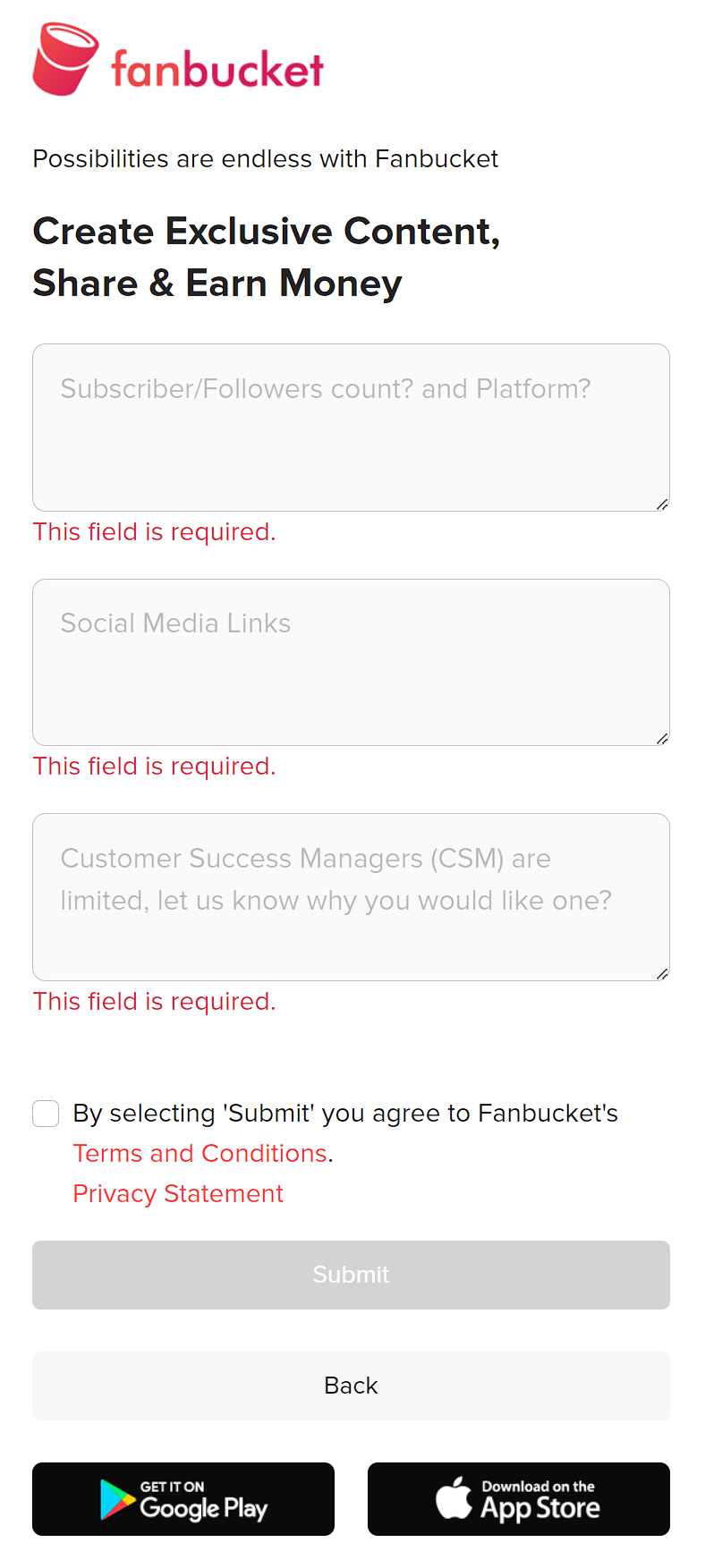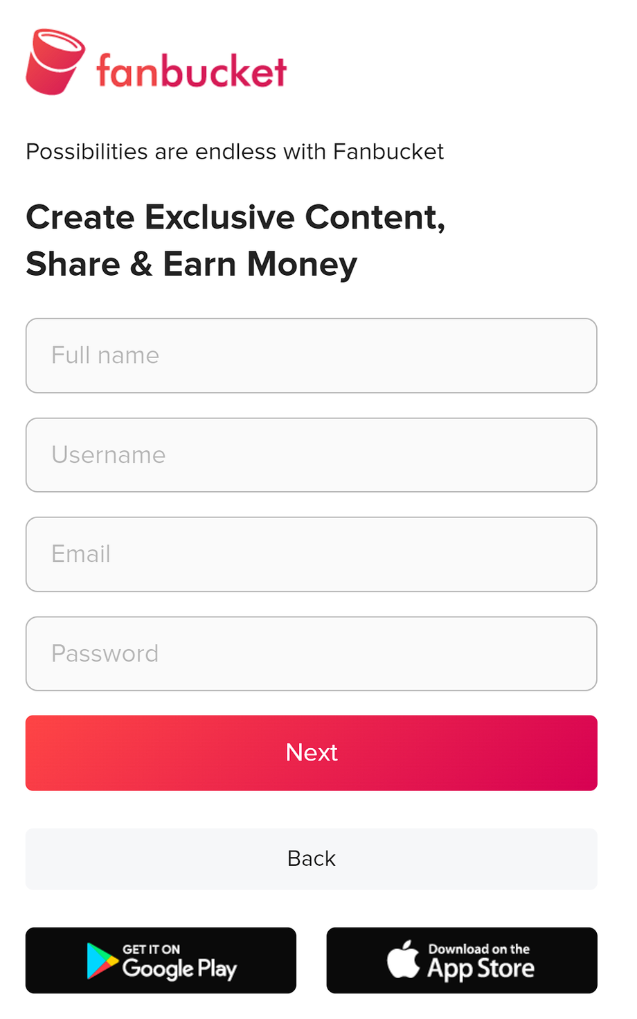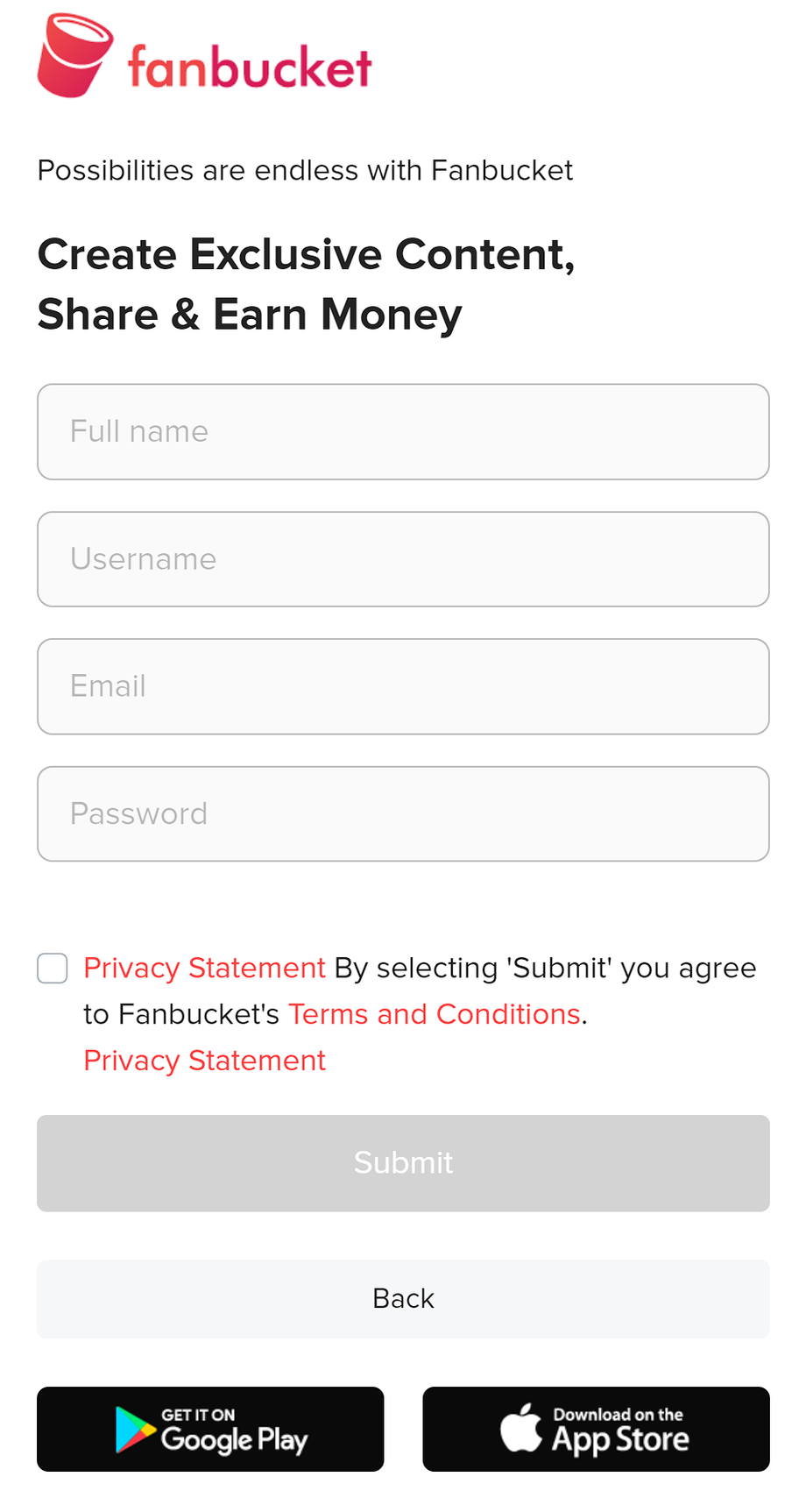 - Username: Choose a unique username that will represent you on Fanbucket.