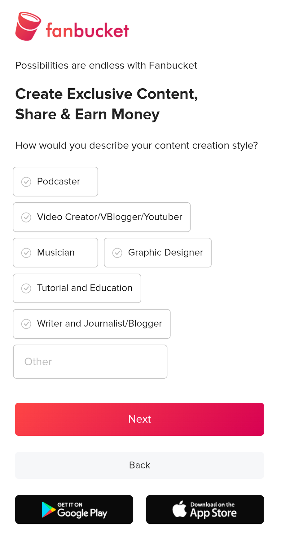 Podcaster, Video Creator/Vlogger/YouTuber, Musician, Graphic Designer, Tutorial and Education, Writer and Journalist/Blogger. If your category is not listed, you can enter your own description in the "Other" field.