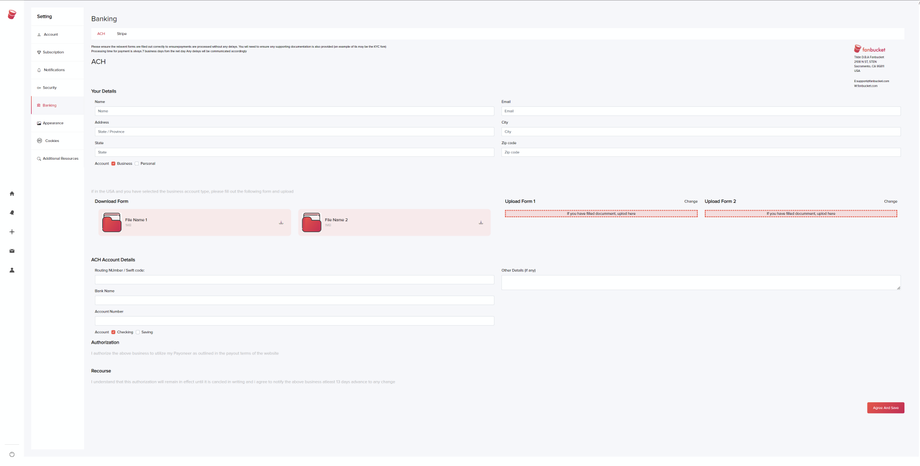 Proceed to the "Banking" tab in the Settings section to provide your banking information for ACH (Automated Clearing House) transactions.